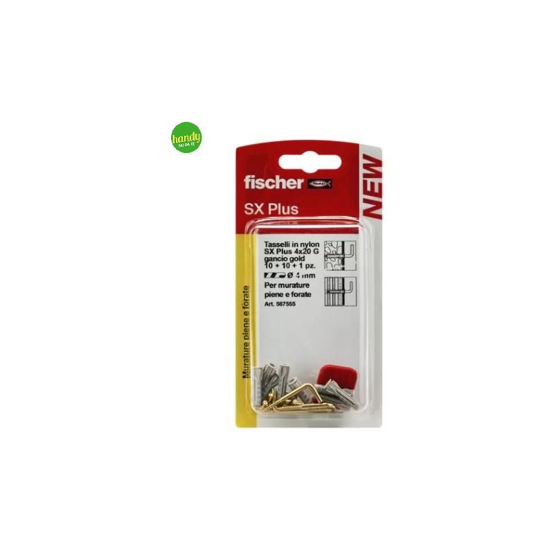 Tasselli + Gancio SX Plus prodotti dal brand Fischer. Il tassello in nylon fischer SX Plus, grazie all'espansione a 4 settori, trasferisce le forze in modo ottimale nel supporto, assicurando una tenuta perfetta nei materiali da costruzione pieni e carichi elevati su tutte le murature. L'innovativo design del tassello garantisce un feeling di installazione perfetto, conuna coppia di serraggio sempre sotto controllo. SX Plus è il fissaggio leggero ideale per artigiani e professionisti, ma facile e rapido da utilizzare anche per utenti hobbisty.