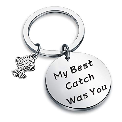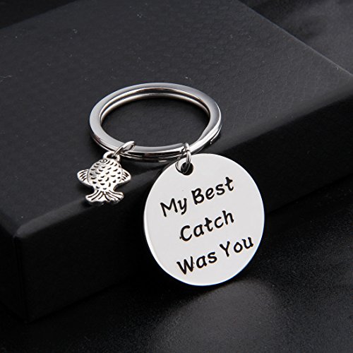 Divertente portachiavi con scritta in lingua inglese "My Best Catch Was You", con scritta in lingua inglese "My Best Catch Was You", esca da pesca per la stagione delle feste. Ottimo regalo per la pesca per il vostro pescatore speciale, perfetto regalo per marito, papà, fidanzato, moglie o amico.