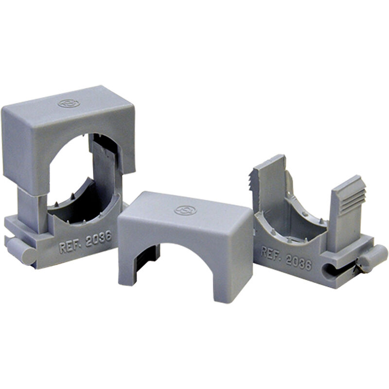 Supporto per il fissaggio di tubi in plastica tramite l'incastro a pressione della parte superiore. Possibilità di collegare fra loro i supporti mediante un sistema di incastro laterale. Graffetta in nylon poliammide 6.6. Autoestrudente. Grigio RAL 7035.