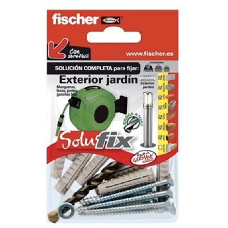 Kit di fissaggio per giardino 502680 solufix fischer kit di fissaggio solufix per il montaggio di accessori da giardino, tubi, faretti, pali, ecc. comprende 8 tasselli sx 8x40mm, 6 viti in acciaio inox 5x50mm, 4 viti lag in acciaio inox 6x50mm, 4 rondelle a2 m6 e 1 punta da trapano numero 8.