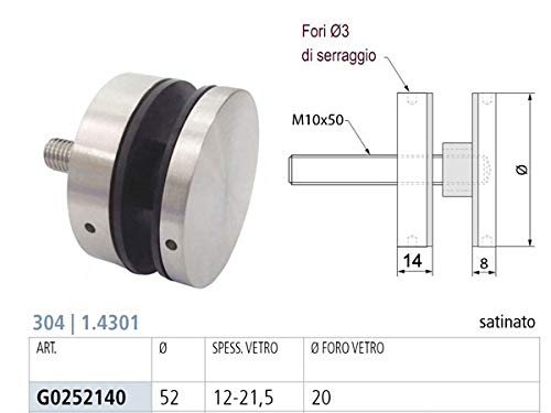 FISSAGGIO A PUNTO IN ACCIAIO INOX AISI 304 TESTA PIANA Ø52 MM - BORCHIA DI SOSTEGNO PER VETRI DA 12 A 21,5 MM DI SPESSORE