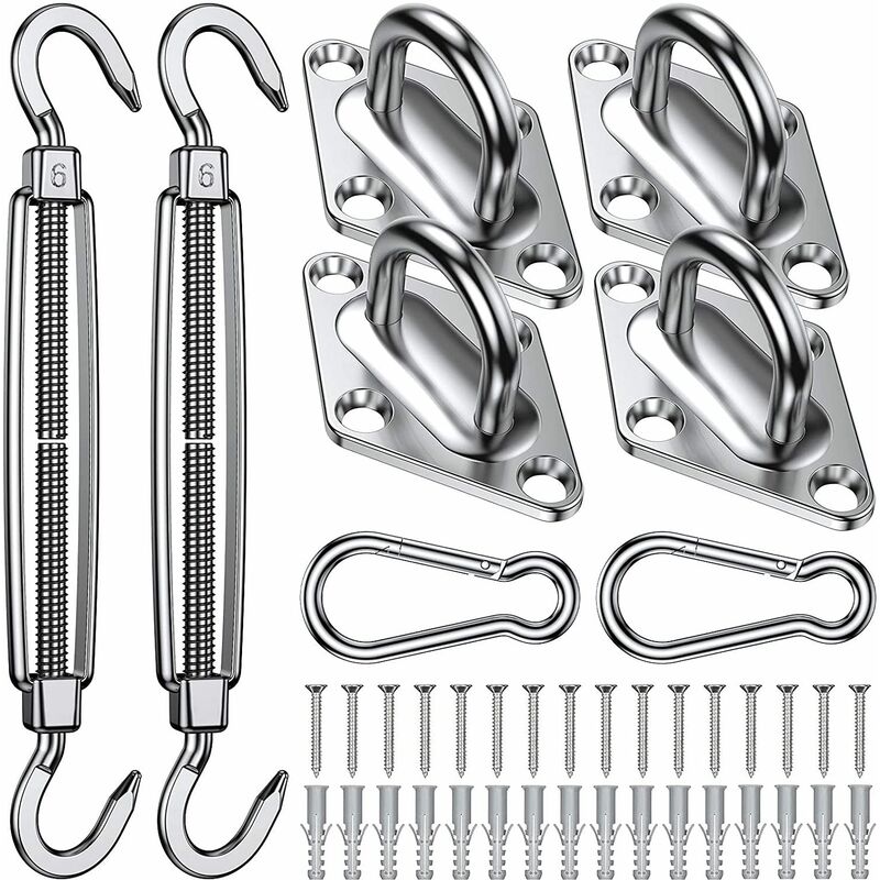 Kit di montaggio per vela parasole: contiene 2 ganci a molla M6, 2 tenditori M6, 4 staffe a parete, 16 viti, 16 tasselli in plastica, il kit di accessori per il fissaggio della visiera garantisce una tensione sufficiente. Il kit di ferramenta Shade Sail viene fornito con l'essenziale in modo da poter appendere la tua vela ombreggiante in modo sicuro e semplice. Sicuro e antiruggine: i kit di ferramenta per vela ombreggiante per impieghi gravosi sono realizzati in acciaio inossidabile 304 di alta qualità con una robusta resistenza alla ruggine e alla corrosione per garantire la durata. Elevata capacità di carico: il kit di ferramenta per vele ombreggianti è estremamente resistente alle intemperie e al vento forte, impedendo alla tua vela solare di essere sospinta da vento forte o oscillare a causa delle cattive condizioni meteorologiche. Si adatta alla maggior parte dei tipi di vele ombreggianti impermeabili per appendere in modo semplice e sicuro la tua tenda da sole. Installazione