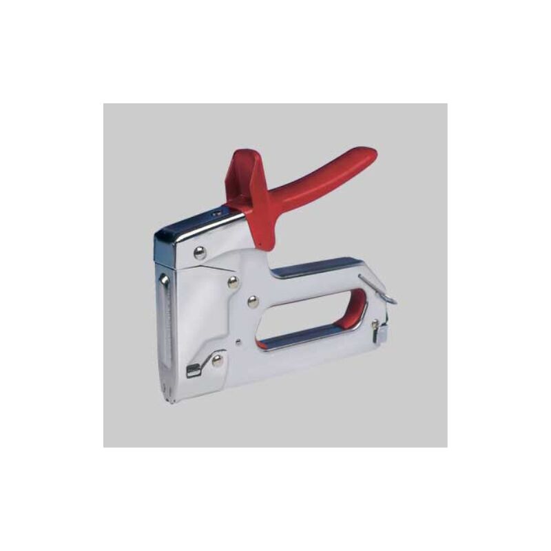 Corpo in acciaio cromato, maniglia rivestita in plastica isolante. Utilizza graffe per cavi elettrici e telefonici sezione 5,5 mm. Fissatrice manuale per cavi m77 Cucitrici e punti