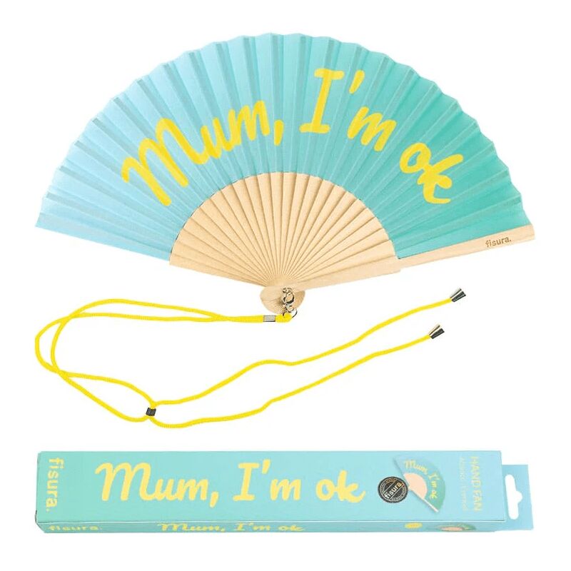 Ventaglio 'Mum, I'm Ok' Blu E Giallo Rinfrescati e divertiti al massimo con questo ventaglio originale nei toni del blu e del giallo, che darà un tocco di colore al tuo look. Con il suo messaggio in inglese 'Mom, I'm Fine,' è l'accessorio estivo perfetto per le tue avventure. Porta con te questo ventaglio con messaggio e scatta una foto per far vedere a tua mamma che ti stai divertendo! Include un pratico gancio, così lo avrai sempre a portata di mano e non dovrai preoccuparti di perderlo mentre dai il massimo sulla pista da ballo o ti immergi tra la folla a un festival. Prenditi cura del pianeta e sii rispettoso dell'ambiente affinché la temperatura smetta di salire. Sia tu che 'Madre Terra' sarete più freschi grazie a questo ventaglio in legno e tessuti provenienti da foreste gestite in modo sostenibile. Il ventaglio della festa è il regalo perfetto per quegli amici che amano vivere ogni momento al massimo e non perdono l'occasione di andare alla scoperta del mondo o partecipare