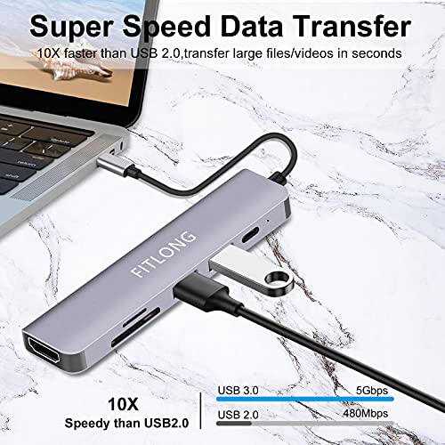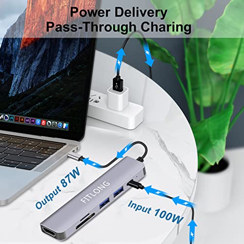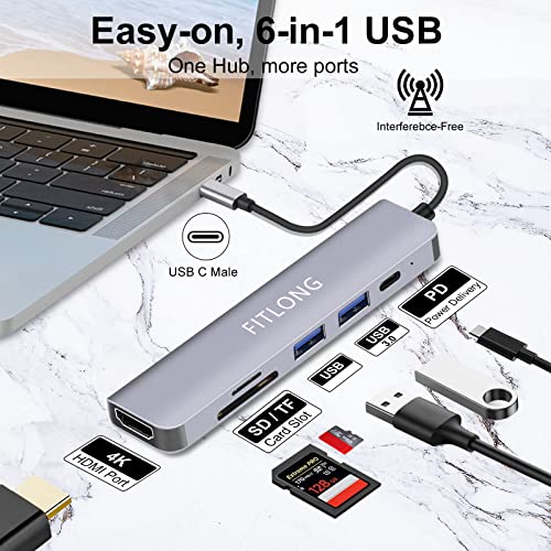 FITLONG Hub USB C 6-in-1, Adattatore MacBook Air/Pro, Adattatore USB C con HDMI 4K, PD 100W, 2 porte dati USB-A, Lector SD/TF, compatibile con laptop e altri dispositivi USB C