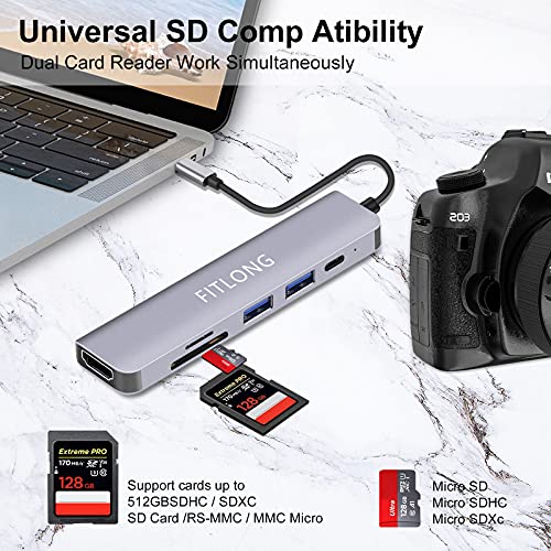 [Ampia gamma di funzioni - 6 in 1] L'hub USB C FITLONG combina 6 delle porte più utilizzate. Hub di tipo C con 1 * porta HDMI 4K, 2 * porte USB, 1 * porta di ricarica PD, slot per schede SD / microSD / TF. Plug and play senza bisogno di installare i driver. Tutte e 6 le porte ti consentono di connetterti contemporaneamente, soddisfare tutte le tue esigenze di lavoro e aumentare l'efficienza del tuo lavoro.