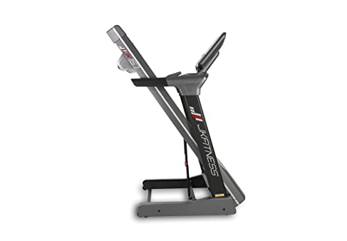 Fascia cardio: jk di serie - pedana: pieghevole, apertura servoassistita da pistone idraulico - piano di corsa: 51 x 140 cm ammortizzato da 4 elastomeri con molle + 4 elastomeri - diametro rulli: anteriore 50 mm - posteriore 46 mm - nastro: antiscivolo su tela cotone tramatura doppia, 1,6 mm - accessori: ingresso mp3 + altoparlanti + usb per la ricarica del proprio dispositivo + bluetooth per apps zwift*, kinomap* e fitshow + 2 portaborraccia + supporto per tablet - ruote trasporto: si - preassemblato:no