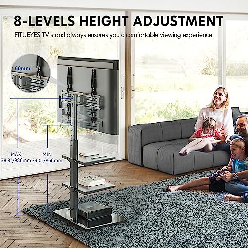 FITUEYES Supporto TV da Pavimento Bello e Robusto per 32-60 Pollici, 70° Girevole e 8 Altezza Regolabile Mobili Porta TV da Terra con 3 Ripiani e Base in 8 mm Vetro Temperato, Max VESA 600x400mm 30kg