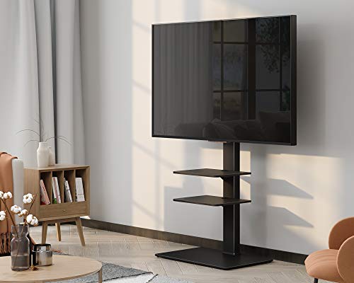 FITUEYES Supporto TV da Pavimento 1.4M più Spesso e Grande per 32-65 Pollici, 10mm Vetro Base Mobile Porta TV da Terra con 60° Girevole & 6 Altezza Regolabile & 3 Ripiani, Max VESA 600x400mm 40kg