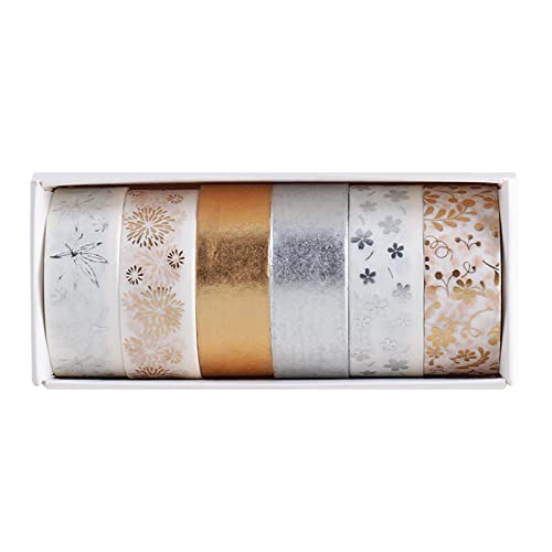 COLORE: ogni rotolo di nastro washi misura 15 mm/0,6 pollici di larghezza x 2 m/6,56 piedi di lunghezza. 6 rotoli, stampa a caldo oro e argento.