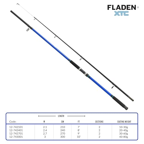 Fladen XTC - Canna da pesca componibile in 2 pezzi (2,1 m, 2,4 m, 2,7 m, 3 m), per uso generico, per pesca spinning (pesi di lancio: 10-30 g/15-40 g/20-60 g/40-80 g), per mare e acqua dolce, colore: blu e bronzo.