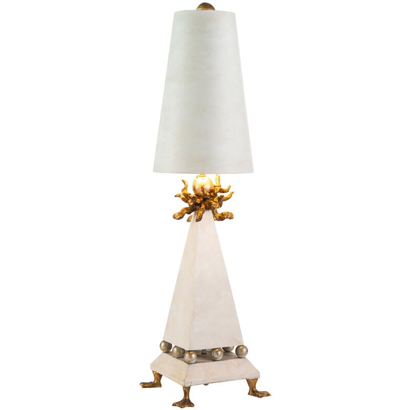 Collezione Leda FOGLIA D'ORO E ZAMPA D'ANATRA Lampada da tavolo a 1 luce . Elementi in foglia d'oro a zampa d'anatra sostengono un corpo lampada affusolato in patina crema, decorato con sfere in foglia d'argento e un fiore in foglia d'oro. Completano il tutto un paralume affusolato in finitura coordinata e un terminale a sfera.