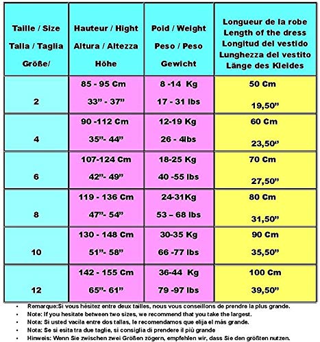taglia 8 = statura:119/124. 136 cm - Lunghezza del vestito: 80 cm - taglia 10 = statura: 130/148 cm - lunghezza del vestito: 90 cm - taglia 12 = statura: 142/155 cm - lunghezza del vestito: 100 cm lunghezza del vestito: a titolo indicativo