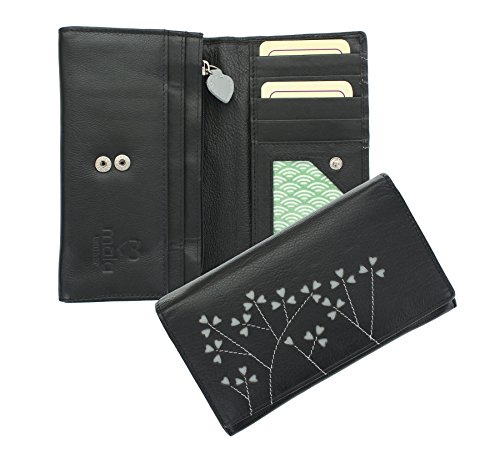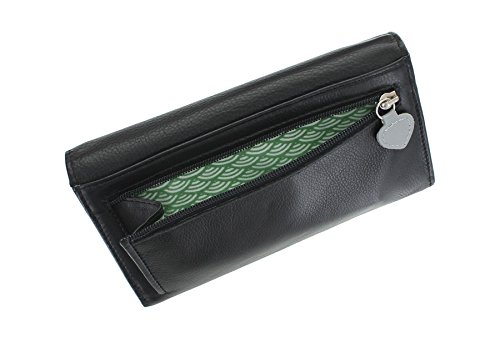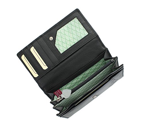 2 scomparti per banconote e una grande tasca centrale per monete con cerniera. La borsa presenta tirature con zip a contrasto a forma di foglie di banyan ed è cieca goffrata all'interno con il logo Mala Leather Tasca posteriore con cerniera adatta anche per monete