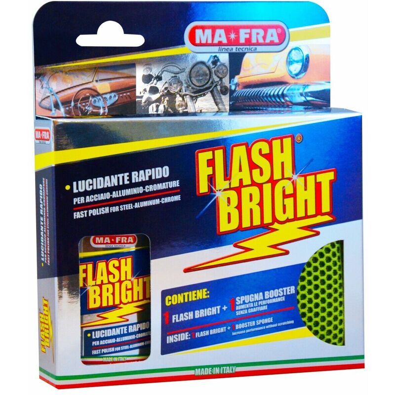 Polish lucidante per acciaio e cromature Garantisce una lucentezza profonda e duratura Protezione contro la corrosione e i raggi UVA Ripristina la lucentezza originaria Descrizione Dalla Linea Tecnica MA-FRA è nato FLASH BRIGHT: il nuovo polish lucidante rapido per superfici della carrozzeria in cromo, acciaio, ottone e lega. FLASH BRIGHT, è il prodotto per lucidare l'esterno auto di facile stendibilità e rimozione, garantisce una lucentezza profonda e duratura, senza creare micrograffi, ripristinando la brillantezza originaria e fornendo un'efficace protezione contro la corrosione e i raggi UVA, senza lasciare aloni untuosi difficili da rimuovere. Il prodotto è specificatamente studiato per pulire, lucidare la carrozzeria, rinnovare, rimuovere piccoli graffi e leggere ossidazioni da acciaio, ottone e lega. La confezione di FLASH BRIGHT contiene un flacone di prodotto da 80 ml e la Spugna Booster. La spugna Booster è uno strumento di lavoro dedicato a FLASH BRIGHT, capace di esaltarne