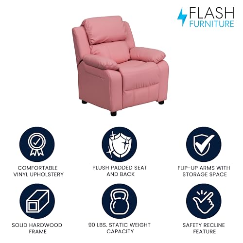 Flash Furniture Deluxe Heavily Padded Contemporary Beige Vinyl Kids Recliner with Storage Arms, Pink, 39" D x 25" W x 28" H