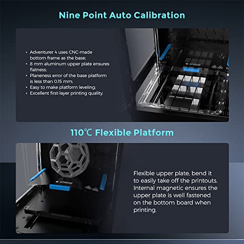 Piattaforma flessibile CNC a livellamento automatico: La piattaforma è composta da una base di installazione CNC livellante e da una piastra in lega composita ultrapiatta da 0,8 mm. Adventure 4 ha un'eccellente qualità di stampa e un alto tasso di successo. È sufficiente piegare la piattaforma per rimuovere la creatura in 5 secondi.