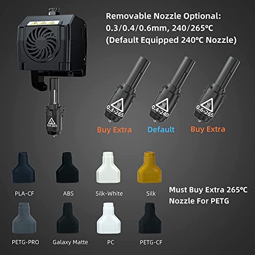 Ugello rimovibile e supporto per filamenti diversi: l'ugello clip-on sostituibile in 3 secondi senza attrezzi per la sostituzione e la manutenzione. L'ugello da 240/265 ℃ può supportare diversi filamenti come ABS/PC/PLA/PLA-CF/PETG/PETG-CF. (È necessario acquistare 0,6 mm/265 ℃ supplementari per il PETG)