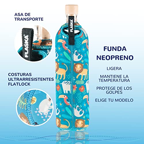 FLASKA | Bottiglia d'acqua in vetro programmato | 300 ml | Mondo animale | Struttura acqua per bambini | Custodia in neoprene | Bevande fredde e calde | Senza BPA | Ecologica | Borsa, Collegio
