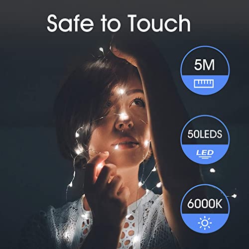 Flaspar Stringa Luci Led Batteria, 5 metri 50 Led Rame filo luci natalizie a batteria con filo d'argento, luci stringa impermeabili per camera da letto, cortile, confezione da 2, Bianco Freddo
