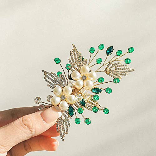 Flayem Fermaglio per capelli da sposa con foglie dorate e perline verdi, elegante per feste di ballo e damigelle d'onore