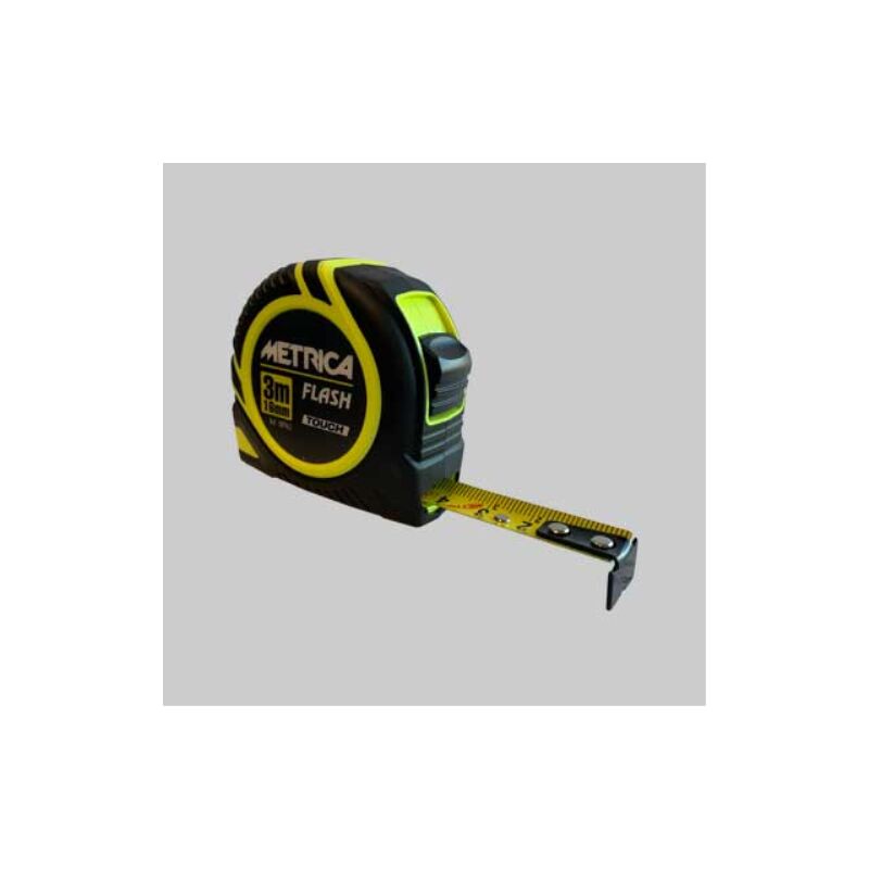 Cassa bimateriale rivestita in gomma antiscivolo. Nastro rivestito in nylon antiabrasione, antiacido, antiriflesso. Elevata scorrevolezza del nastro. Numerazione chiara e visibile. Design compatto. Dotato di clip. Flessometro flash touch metrica mt 8x25 mm METRICA Flessometri