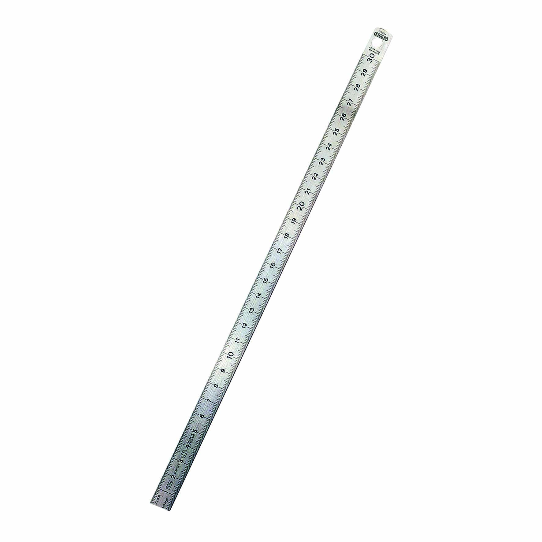 Riga flessibile in acciaio inox lunghezza cm 30. Graduazione recto verso: 1 faccia in mm e verso in 1/2 mm. Larghezza mm 13 x 0,45