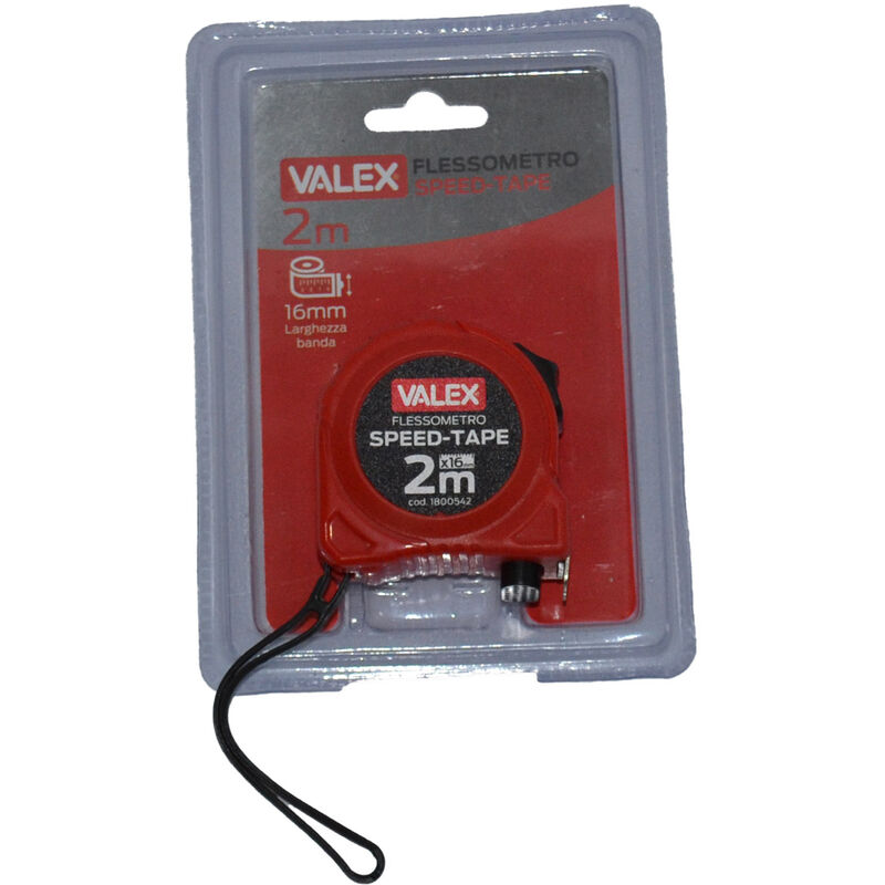 Flessometro - Marca Valex - In ABS - Con cinghietta anticaduta - Lunghezza 2 mt - Larghezza 16 mm Flessometro speed - tape Valex con corpo in ABS antiurto, doppio tasto di controllo, cinghietta anticaduta e clip per cintura. Molla interna trattata termicamente per una maggior durata. Lunghezza 2 metri, larghezza 16 mm.