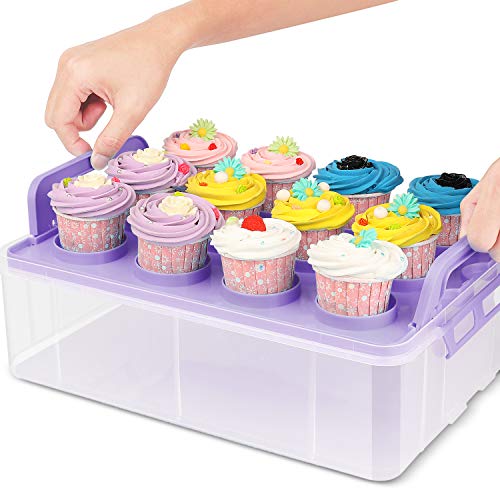 Flexzion Scatola contenitore per cupcake muffin e dolci (24 spazi, 2 livelli) - Portautensili 24 cupcake muffin o 2 torte grandi pasticceria compleanno natale festa, Cestello porta dolci (Viola)