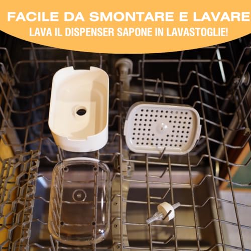 È UN DESIGN STUDIATO PER DURARE - Questo dosatore detersivo piatti è costruito con materiali di alta qualità rispetto ai concorrenti, ABS e PP, ultraresistente, con una molla interna che non arrugginisce mai e sopporta forti urti!! Inoltre è facile da smontare e lavabile con sola acqua calda nel lavello oppure in lavastoviglie!!