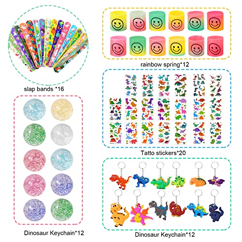 【Set di giochi di dinosauri di grande valore】: questi giochi di dinosauri hanno 10 palline di polvere di cristallo, 12 portachiavi di dinosauri, 12 cerchi di smiley arcobaleno, 16 anelli di rubinetto ibridi di unicorno di dinosauro e 20 adesivi di tatuaggi finti di dinosauro, che fioriranno per la brillantezza della tua festa.
