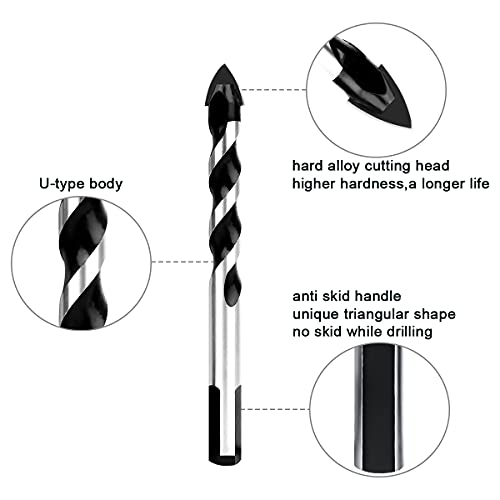 MANIGLIA TRIANGOLARE: Il design con scanalatura a U consente una rapida rimozione della polvere di perforazione. Il design della maniglia triangolare, il funzionamento più stabile, senza scivolare e graffiare, non danneggerà lo smalto delle piastrelle. (il bordo del trapano e il foro sono lisci e completi, senza lasciare sbavature)