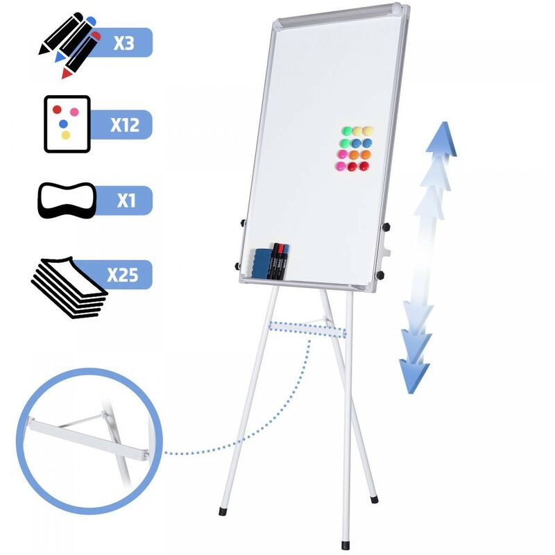 Per un brainstorming efficace a casa, in seminari o in ufficio, le note chiare hanno un valore inestimabile. Il nostro flip chart aiuta a chiarire e organizzare le cose evitando inutili dimenticanze, e viene utilizzato nelle scuole, nei luoghi di lavoro e persino a casa, per far giocare i bambini o per registrare i compiti da fare. Penne e pennarelli possono essere riposti comodamente nel vassoio integrato. Inoltre, la superficie lavabile della lavagna a fogli mobili è rivestita con vernice magnetica, quindi è possibile utilizzare i dodici magneti inclusi per aggiungere foto o poster. L'altezza può essere regolata manualmente tra 103 e 165 centimetri, rendendola adatta anche ai bambini. Lavagna metallica verniciata, magnetica Superficie in bianco facile da pulire e resistente ai graffi Pratico vassoio per pennarelli Elevata stabilità grazie al cavalletto Nessun assemblaggio richiesto, basta sollevarlo Treppiede regolabile in altezza: da ca. 103 a 165 cm Dimensioni della superficie di