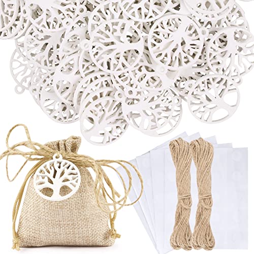 CONFEZIONE: 100 x albero della vita in legno decorativi piccoli bianchi + 100 x di biadesivo trasparente + 20 metri corda di iuta per decorazione bomboniere matrimonio battesimo prima comunione laurea cresima .