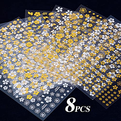 FLOFIA 8 Fogli Adesivi Unghie Nail Stickers Autoadesivi per Unghie Fiori Adesivi Unghie Floreali per Decorazione Nail Art Fai da Te Oro Bianco