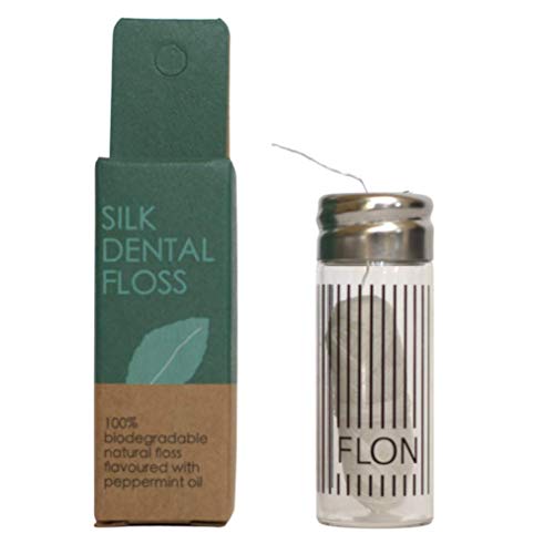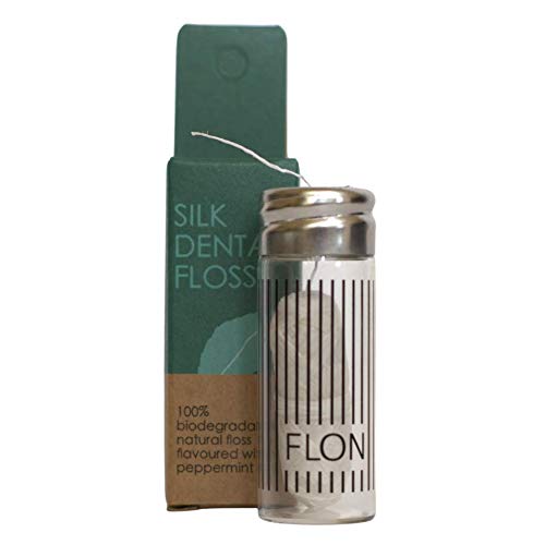 Flon, filo interdentale in seta ecologico, 30 m, senza sprechi, biodegradabile, senza filo naturale e confezione in dispenser in vetro riutilizzabile, seta pace, cera Candelilla + aroma menta
