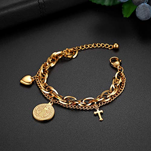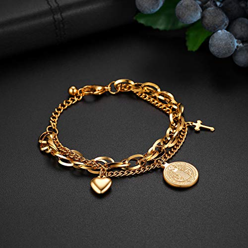 Flongo Bracciale da Donna, con Ciondolo Cuore Croce, in Acciaio Inossidabile Lucido, Colore Oro,Regalo per Donna,Bracciale Amicizia