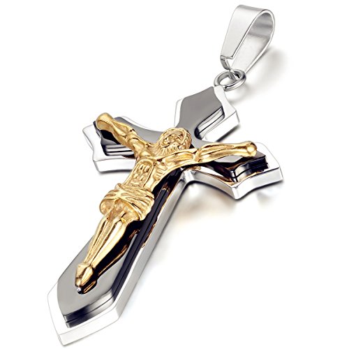 Flongo Collana Ciondolo Fashion CrociFisso Gesu in Acciaio Inossidabile Colore Oro/Nero