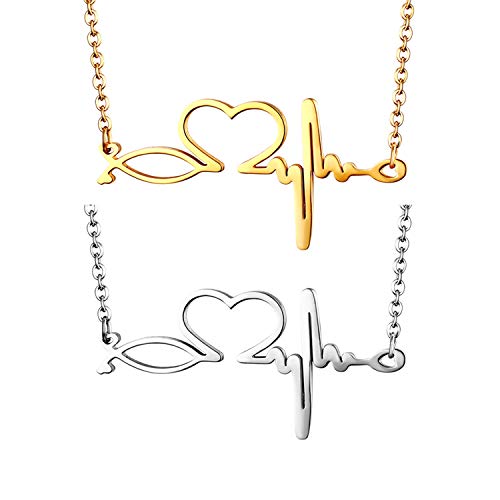 Flongo Collana elettrocardiogramma Ciondolo Cuore per Donna, Collana in Acciaio Inossidabile Argenteo Girocollo Originale Regalo di Natale San Valentino, Catena 50cm