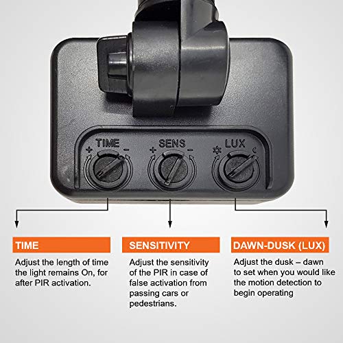 SENSORE PIR REGOLABILE: il sensore di rilevamento copre un angolo di 120 gradi e una distanza di rilevamento da 5 a 10 m. Altezza di montaggio consigliata da 1,8 ma 2,5 m. Viene fornito con tre caratteristiche del sensore PIR regolabile: durata del tempo in cui la luce di fondo deve rimanere accesa;