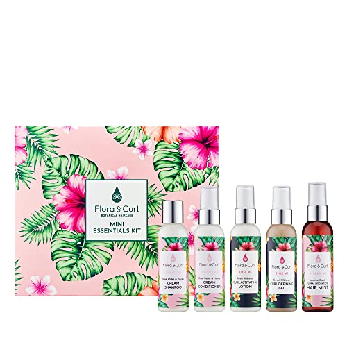 Flora & Curl Mini kit essenziale per capelli naturali crespi e ricci, include shampoo, balsamo, lozione attivante ricci, gel per definire i ricci e nebbia per capelli per donne