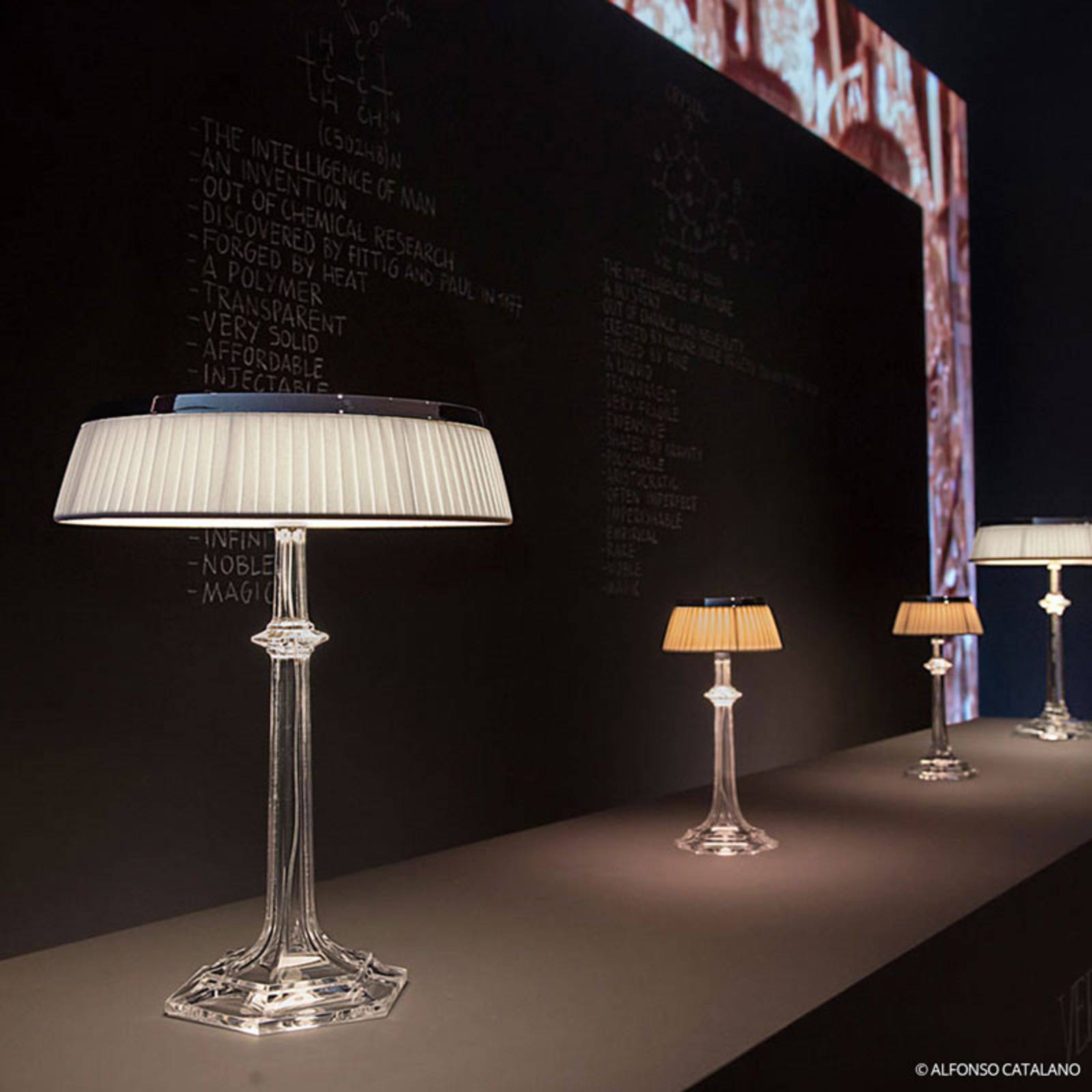 Lampada da tavolo a LED Bon Jour Versailles - un capolavoro di FLOS Presente e futuro entrano in perfetta simbiosi nella lampada da tavolo a LED Bon Jour Versailles, perché da un lato la base della lampada, realizzata in nobile polimetilmetacrilato a colata appuntita, ricorda un classico candeliere del passato, e dall'altro il paralume che vi si trova sopra, rivestito in tessuto plissettato di colore bianco, irradia una certa modernità, conferendo alla lampada un'espressione affascinante nell'insieme. I LED integrati nel paralume creano una piacevole luce bianca calda, che il paralume in tessuto plissettato attira e distribuisce uniformemente nell'ambiente circostante. L'intensità luminosa è regolabile in modo continuo grazie al dimmer integrato. Il designer parigino Philippe Starck ha creato questo oggetto di illuminazione per il produttore italiano FLOS. Il suo principio di progettazione è concentrarsi sull'essenziale e tralasciare ogni dettaglio superfluo. Oltre a progettare oggetti di illuminazione, si è fatto un nome anche nel campo dell'interior design, come dimostra il suo lavoro con l'ex presidente Francois Mitterrand.