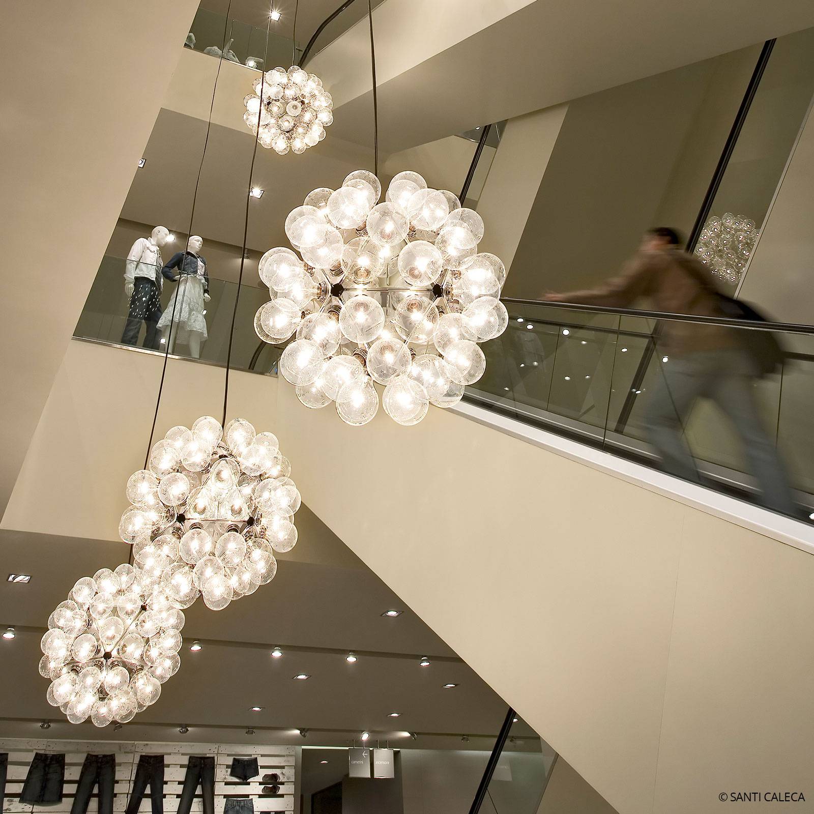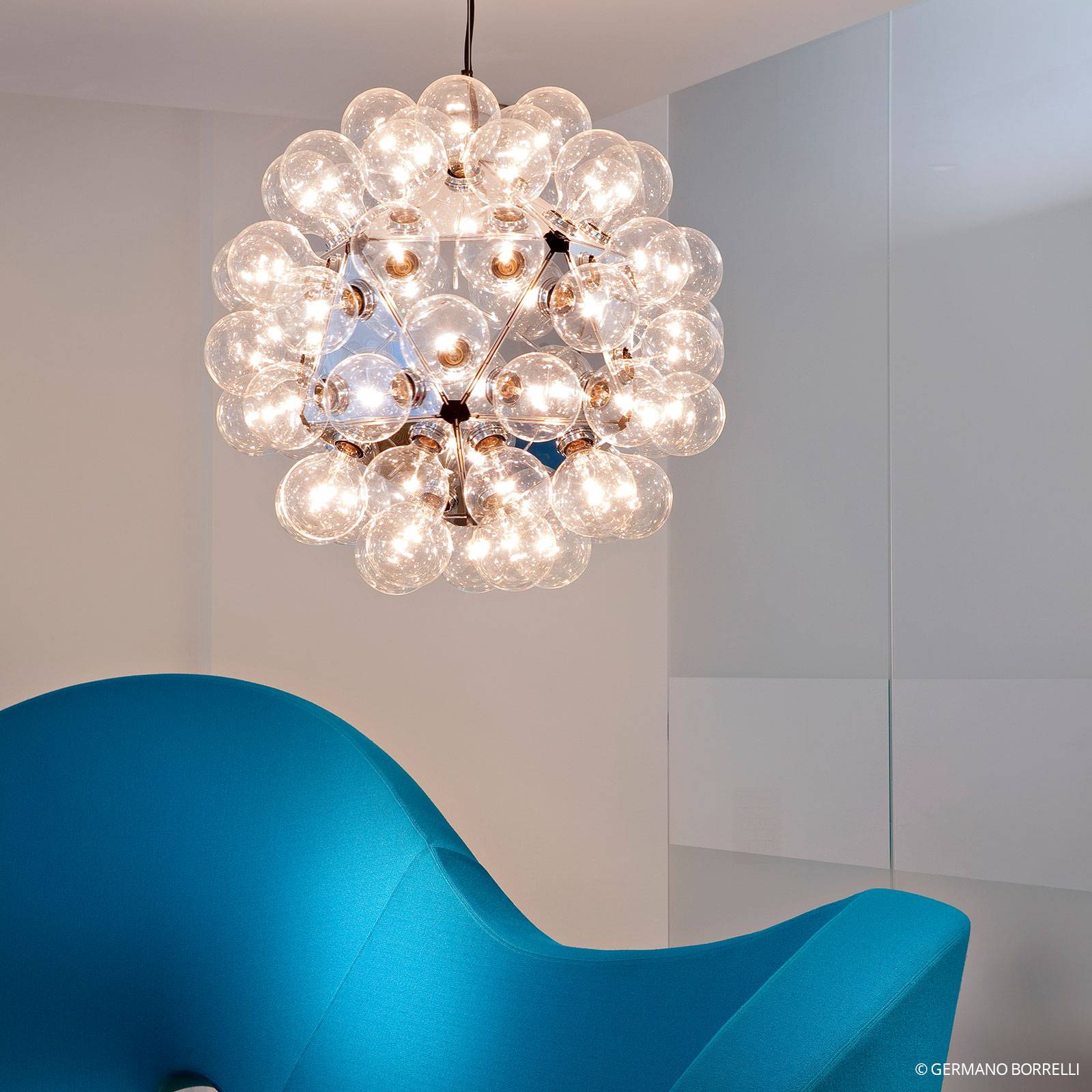 Scintillante lampada a sospensione Taraxacum 88 di FLOS La lampada a sospensione Taraxacum 88 LED risplende di una luce brillante e scintillante grazie alle numerose lampadine LED bianco caldo avvitate nella struttura di questa lampada. In questo modo si crea un aspetto speciale del vetro che fa impressione anche quando è spento. Il cavo di sospensione ha una comoda lunghezza di 5,5 metri e la lampada a sospensione di design può quindi essere montata bene anche in stanze molto alte che hanno già un carattere altezzoso