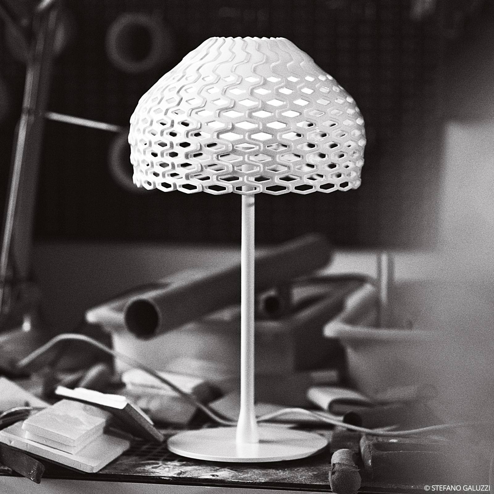 Lampada da tavolo di design Tatou con paralume a motivi decorativi La lampada da tavolo Tatou distribuisce effetti luminosi speciali dalla penna di Patricia Urquiola, il noto architetto e designer spagnolo che ha progettato questa serie speciale di lampade per FLOS. Il paralume in plastica è diviso da tanti piccoli fori per la luce. Sopra il portalampada si trova un diffusore in plastica opalina, che non solo garantisce un'emissione di luce priva di abbagliamento, ma offre anche un'efficace immagine d'insieme. L'azienda italiana di illuminazione FLOS è stata fondata nel 1962 e si distingue per l'eccellente qualità dei suoi prodotti.