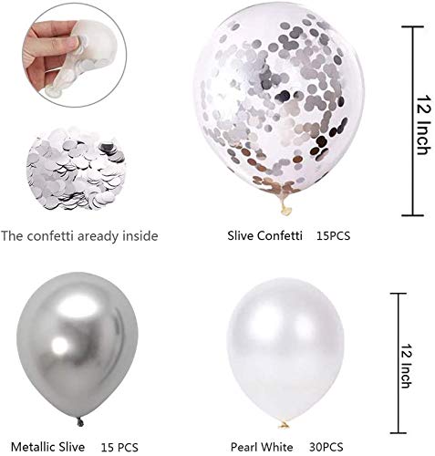 Il set di palloncini per feste include: 30 palloncini in lattice argentato, 10 palloncini in lattice bianco perla, 10 palloncini metallici argentati, 10 palloncini con coriandoli argentati, 2 palloncini da 10 metri. Totale 60 palloncini, tutti i palloncini sono gonfiati da 30,5 cm.