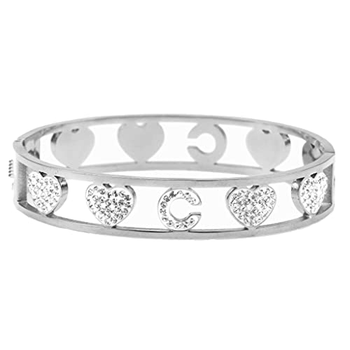 Flowers Bracciale Rigido a Manetta Interamente in Acciaio e zirconcini con Lettera Iniziale Nome e cuori Colorazioni Oro e Argento (Argentato, C)