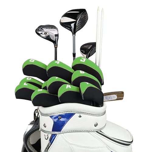 FLTRAD - Set di 12 copriteste da golf in ferro, 3 - 9 AW/SW/PW/LW, in neoprene, riutilizzate, con etichetta numerica e custodia protettiva per regalo, colore: nero e verde