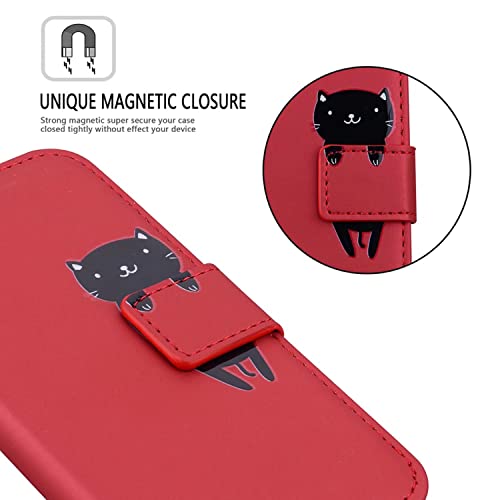 FMPC Custodia in Pelle Compatibile Samsung Galaxy A31, Flip Libro Caso PU Portafoglio Magnetica Porta Carta [Kickstand] Cover Smartphone di Colore Rosso Cartoon Cute Cat