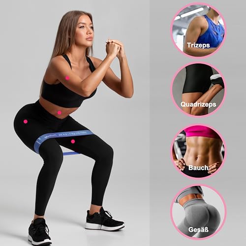 Esercizi stampati su fasce - Ci sono 4 diversi esercizi stampati direttamente su ciascuna fascia di resistenza. Gli esercizi sono in tedesco e sono facili da seguire. Con questi esercizi puoi allungare, tonificare e condizionare tutti i principali gruppi muscolari.