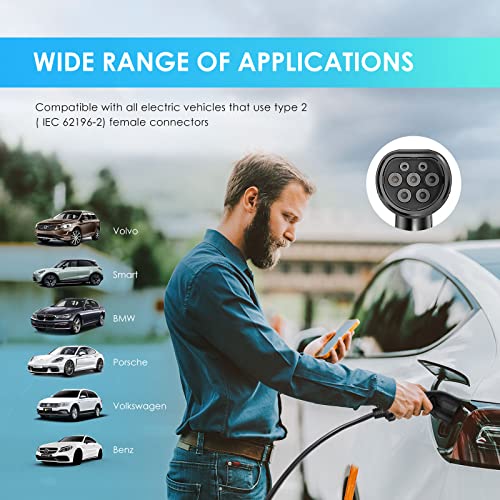 【Qualità e sicurezza assicurate】Il caricabatterie EV di tipo 2 è realizzato in materiale affidabile di alta qualità. Il cavo di ricarica in TPU è stato sottoposto a oltre 10.000 test di resistenza alla flessione, che corrispondono a una durata di 15 anni. L'involucro della scatola di controllo in ABS è abbastanza resistente da sopportare un carico di 1,5 tonnellate. Le autorevoli certificazioni CE e TÜV offrono una garanzia di sicurezza.